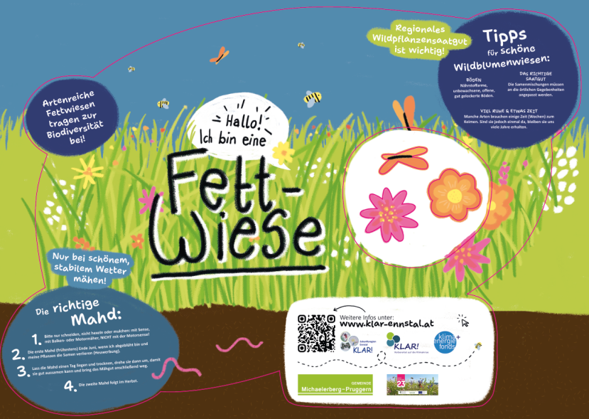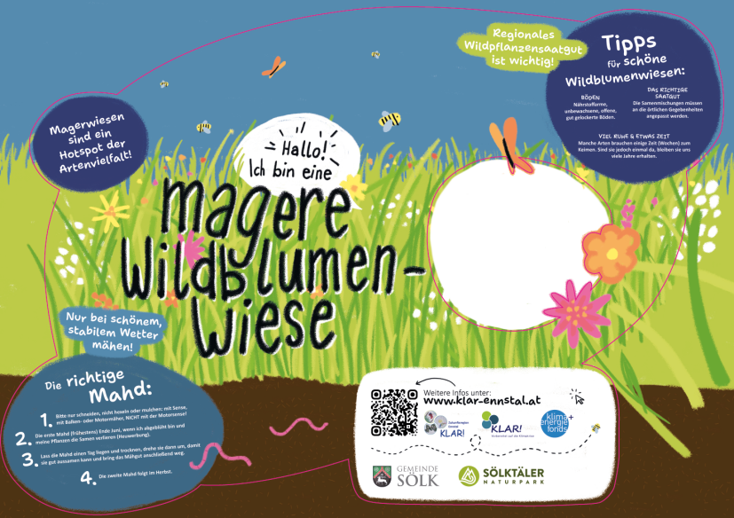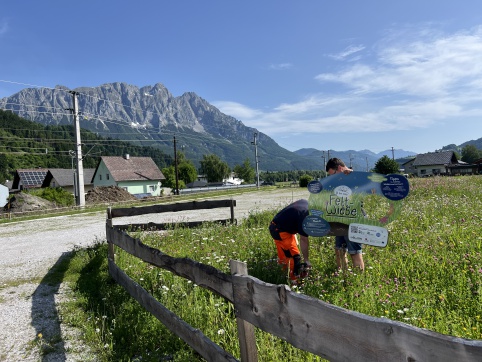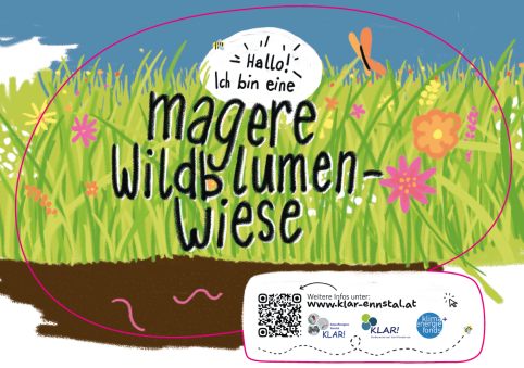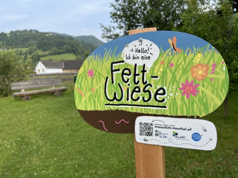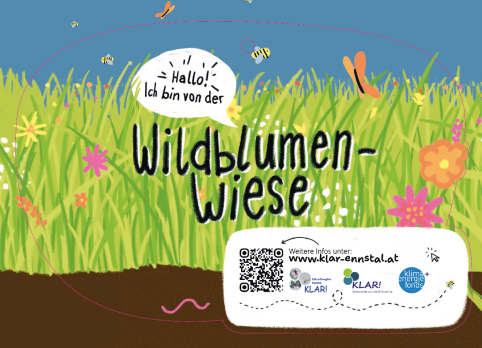 Im Frühjar / Sommer 2025 wurden alle Wildblumenflächen in der KLAR! Zukunftsregion Ennstal mit grafisch gestalteten Informationstafeln in unterschiedlichen Größen (A0 und A3) bestückt. Augemerk wurde dabei auf die etwas andere, runde Form sowie auf für Kinder leicht verständlich formulierte Inhalte gelegt. Die A0 Tafeln enthalten zudem ein Loch, wodurch die Wildblumenwiese gut zu "erblicken" ist.