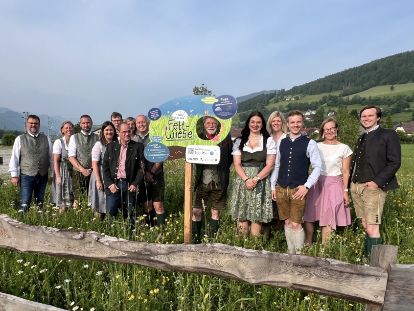 Fototermin des Gemeinderats Öblarn mit KLAR! Managerin Natalie Prüggler bei der Wildblumenwiese beim ÖhA Veranstaltungszentrum.