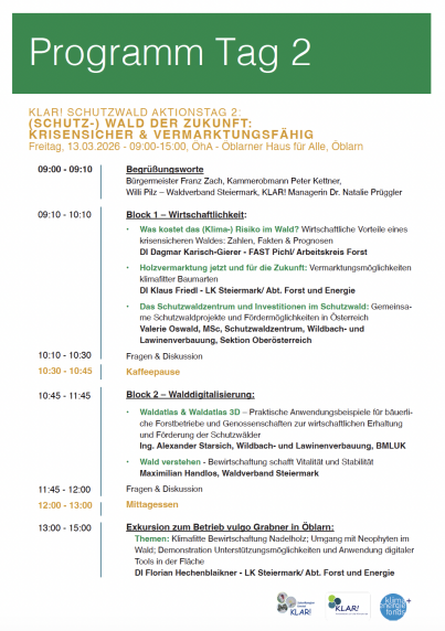 Um Anmeldung per Telefon, WhatsApp/ SMS oder E-Mail wird gebeten:Dr. Natalie PrügglerKLAR! ManagerinMobil: 0660 / 6512128E-Mail: n.prueggler@klar-ennstal.atUnsere Kooperationspartner: